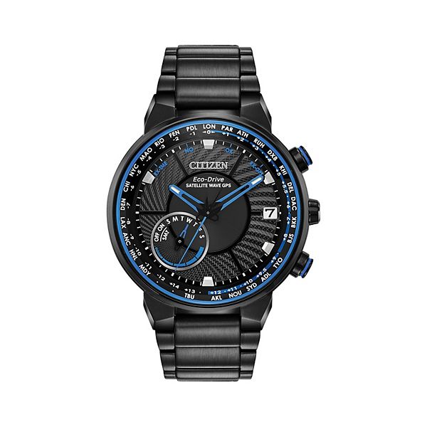 A sleek black ion plated stainless steel case and bracelet black dial and brilliant blue accents featured satellite gps timekeeping technology with worldwide reception and time.